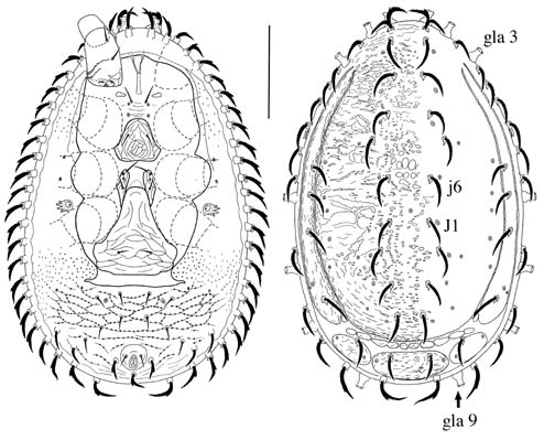 carrying st2–st4 surrounding genital opening covered by two subequal plates; st5 on triangular region of circumventral plate behind coxae IV; with podonotalpodonotal: