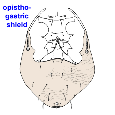 - Dorsum of female with median shield composed of fused podonotalpodonotal: