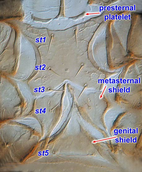 between sternal and metasternal shields oblique; ambulacra of legs II–IV simplesimple: