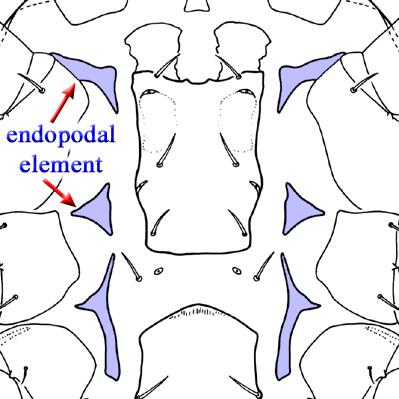peritremes. Ascid mites lack metasternal-endopodal shields. Some hypoaspidine Laelapidae have a metasternal-endopodal shield, but have anal, rather than ventrianal shields.