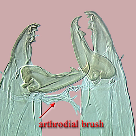 (= palp apotele, palptarsal claw) the most distal segment of the palp; absent in Acariformes, claw-like in Opilioacarida, and a subdistal, tined structure in the Mesostigmata. 2-tined.............................. 6