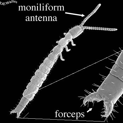 Distinguishing features: long moniliform antennae; long, many segmented pair of cerci or single-segmented pincer-like cerci; eyes absent