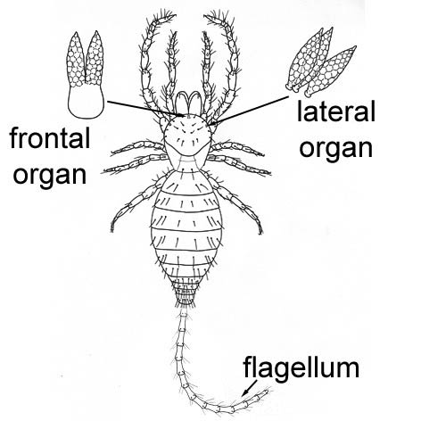Distinguishing features: tail-like flagellum; finger-like median and lateral organs; 3-segmented chelicerae
