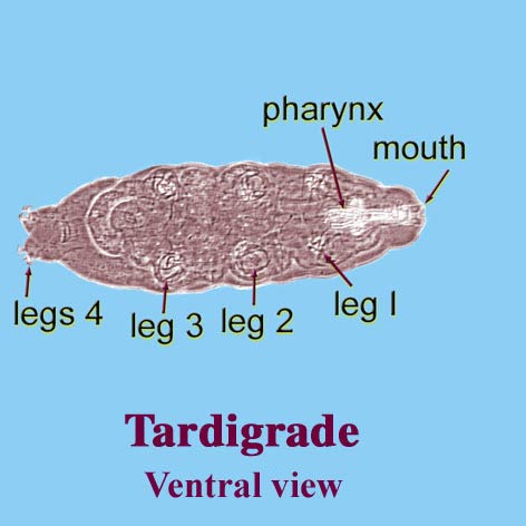 Comments: Tardigrades are commonly known as 'water bears', presumably because of their large claws and ursine build, or perhaps because of their teddy bear-like aspects. Tardi-grade means 'slow walk', an apt description of their movement. Most tardigrades have short, cylindrical bodies with either a smooth integument that lacks armor (Eutardigrada) or a series of armored plates (Heterotardigrada). Some, particularly marine species, have large spines or bodybody: