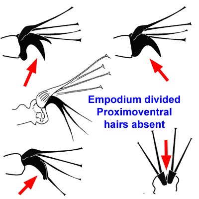 is split distally into 2–3 pairs of 'proximoventral hairs' but usually an empodial clawclaw: