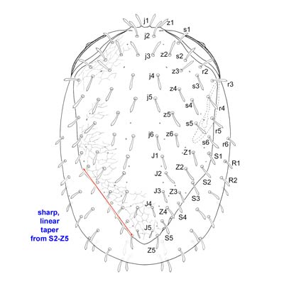 that exposes much of the opisthonotum. The easiest character for recognizing the most commonly encountered species of Stratiolaelaps, S. scimitus (often marketed under the misnomers S. miles or Hypoaspis miles) is the sharp taper of the dorsaldorsal: