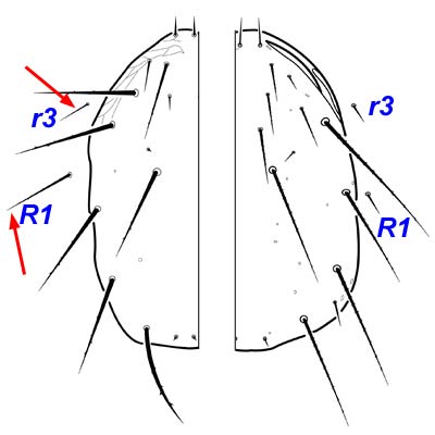 . In Phytoseiulus longipes, however, setae R1 are barbed and much longer than setae r3.