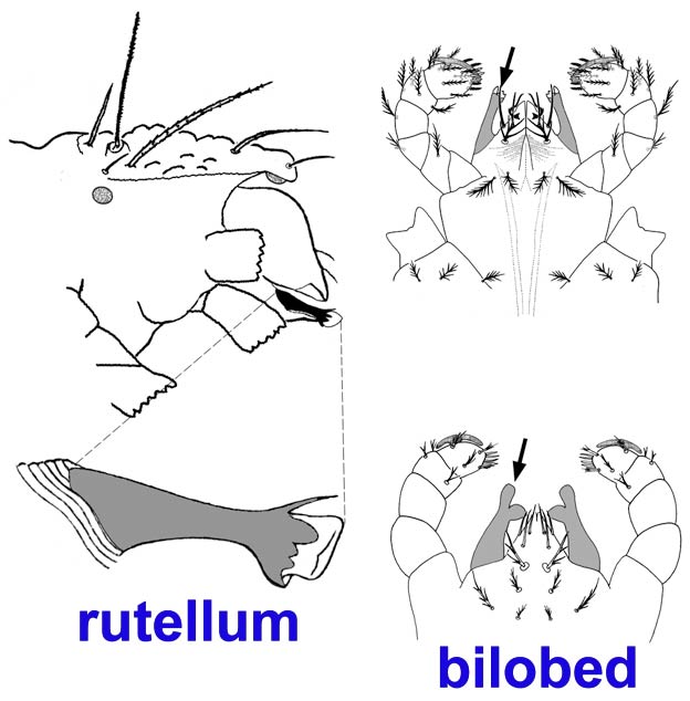 (pl. rutella) In Sarcoptiformes, the hypertrophied setae on the hypostome, often toothed; not to be confused with a corniculus (although possibly a homologue). In Astigmata, the rutellum may be referred to as a pseudorutellum, although it is the same structure. Various forms of rutella are recognized, including the atelebasic and pantelebasic.