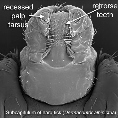 anchor their mouthparts in the skin when feeding. The capitulumgnathosoma: