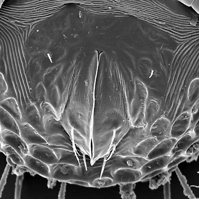 bearing one or more pairs of setae. Most Mesostigmata feed only on fluids (usually externally digested prey) and have a fairly small anal opening covered by a pair of small sclerites and well removed from the genital opening.