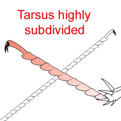 ) or 3 (+acrotarsus) subsegments in some Mesostigmata, or into many subsegments in a few Anystina.