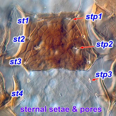 (st1–4) and 3 pairs of lyrifissures or 'pores' (stp1–3). This 'capture' of the metasternal seta is a useful character with some exceptions: