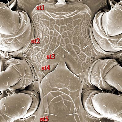 (st1–3) are present in the larva (on a weakly sclerotized sternal shieldsternal shield: