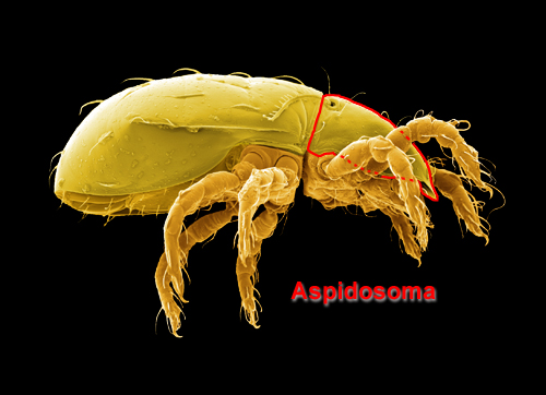 surface visible are the joints of the legs, junctures between sclerotized plates, and areas capable of retraction, such as the legs and margins of the aspidosomaaspidosoma: