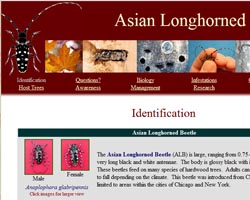 - The Asian longhorned beetle (ALB) is an exotic pest threatening a wide variety of hardwood trees in North America. Adults are large (0.75 - 1.50 inches long) with very long black and white banded antennae. The body is glossy black with irregular white spots. The beetle was introduced into New York City, Chicago and New Jersey, and is a serious pest of hardwood trees. Adults can be seen from late spring to fall depending on the climate. Learn more about it's biology, how to distinguish ALB from other native insects, and what trees it infests.