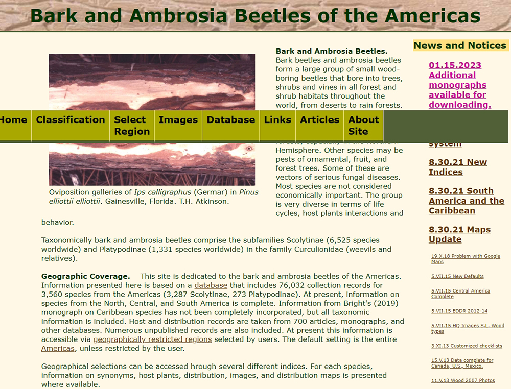 - Until recently, this site has been mainly directed to a narrow audience of persons who are students of the bark and ambrosia beetles. Recent changes to the section on the Bark and Ambrosia Beetles of the Southeastern U.S., especially improvements in the way that images are linked to species and the addition of distribution maps has made that section more useful to a wider group of people. In the relatively near future I expect to start adding more information on biology and habits to continue expanding in this direction.
