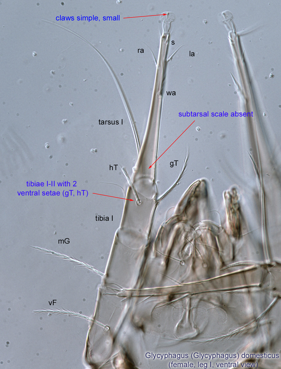 IV (Fig. 4). Without a subtarsal scale (Glycyphagus (Glycyphagus)) (Figs. 4, 11) or with a subtarsal scale Glycyphagus (Lepidoglyphus) (Fig. 9, 10, 12).