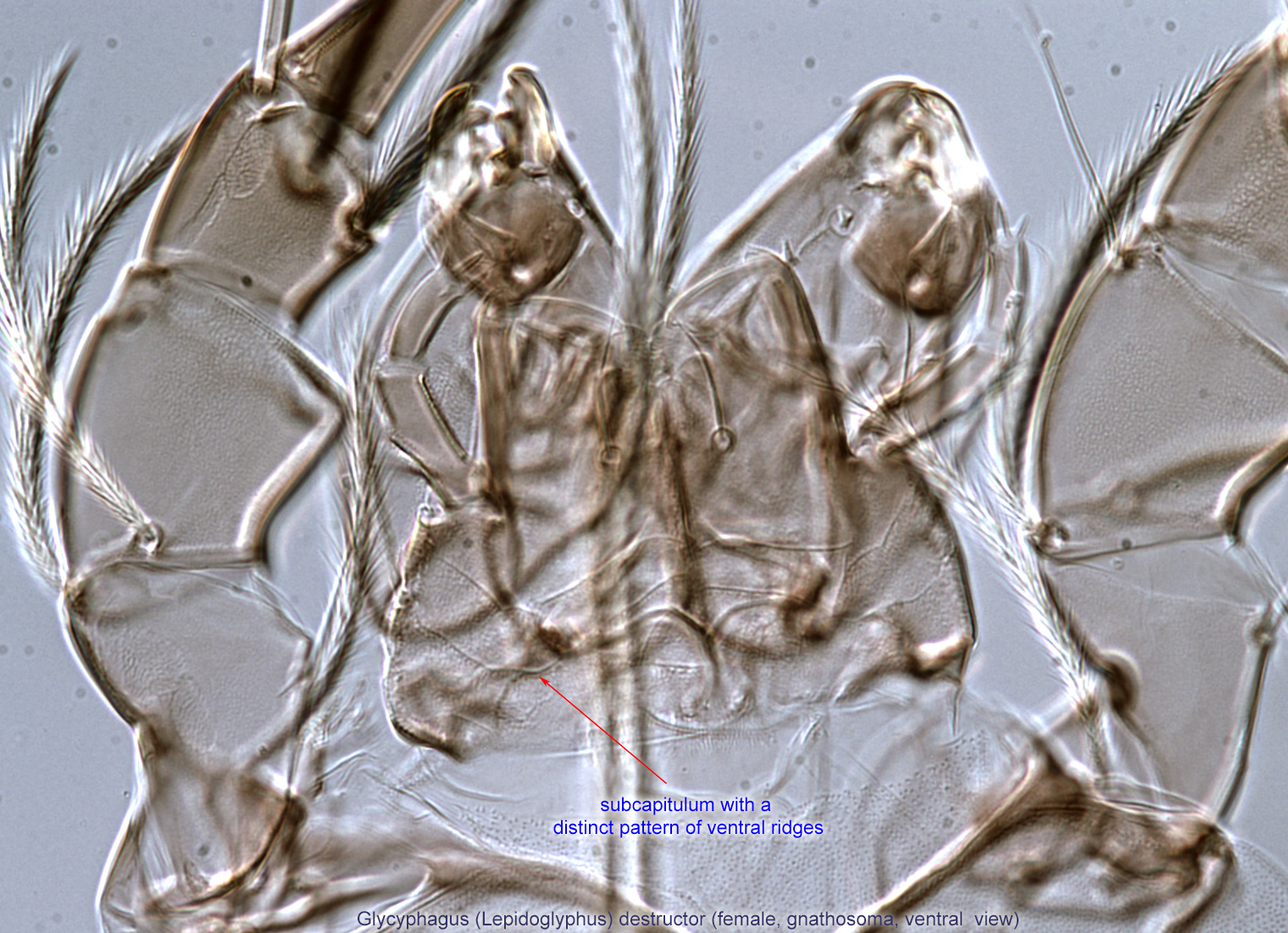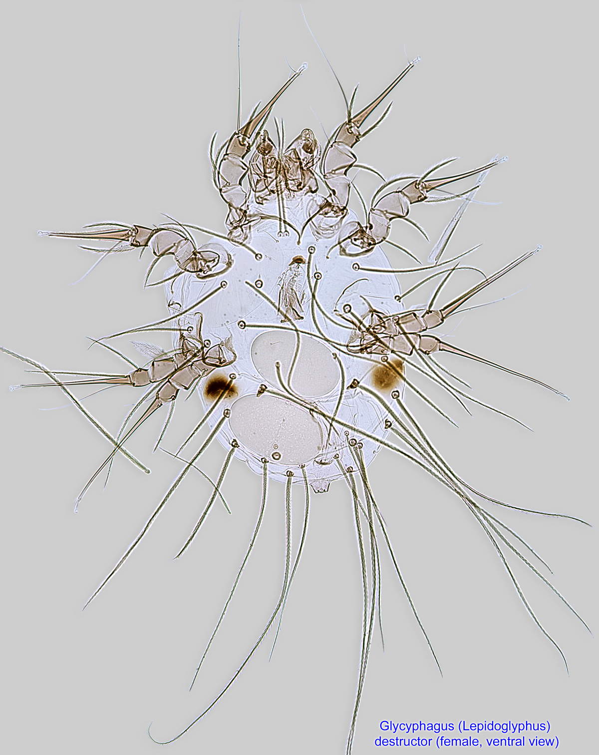 Glycyphagus domesticus: furniture mite, grocer's itch mite, hairy grain mite, house mite; Glycyphagus destructor: storage mite, hay mite, fodder mite