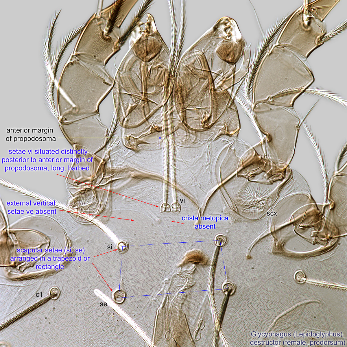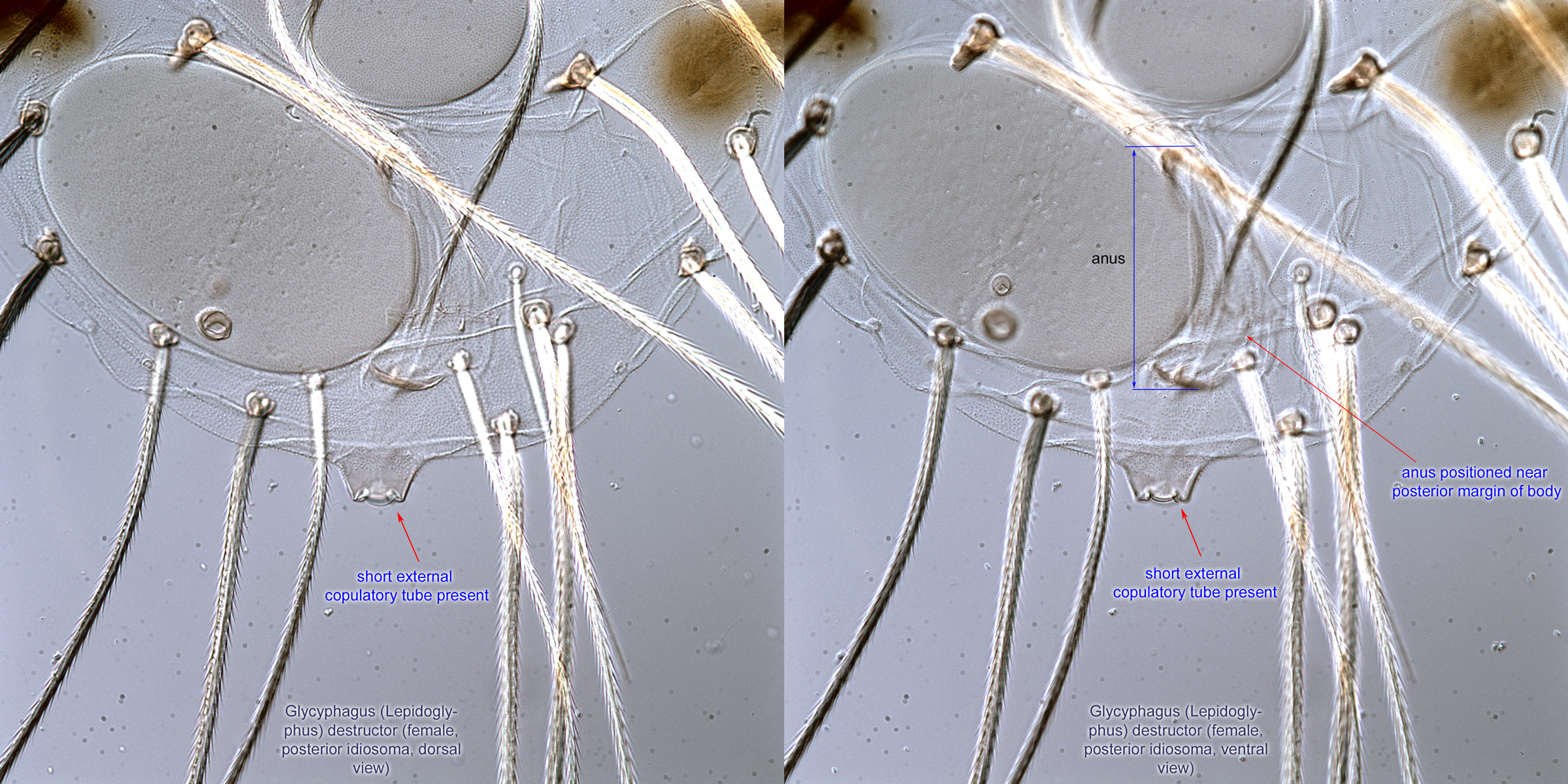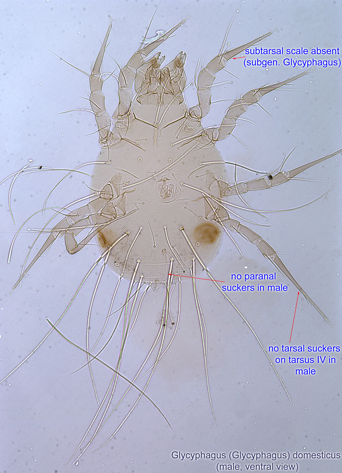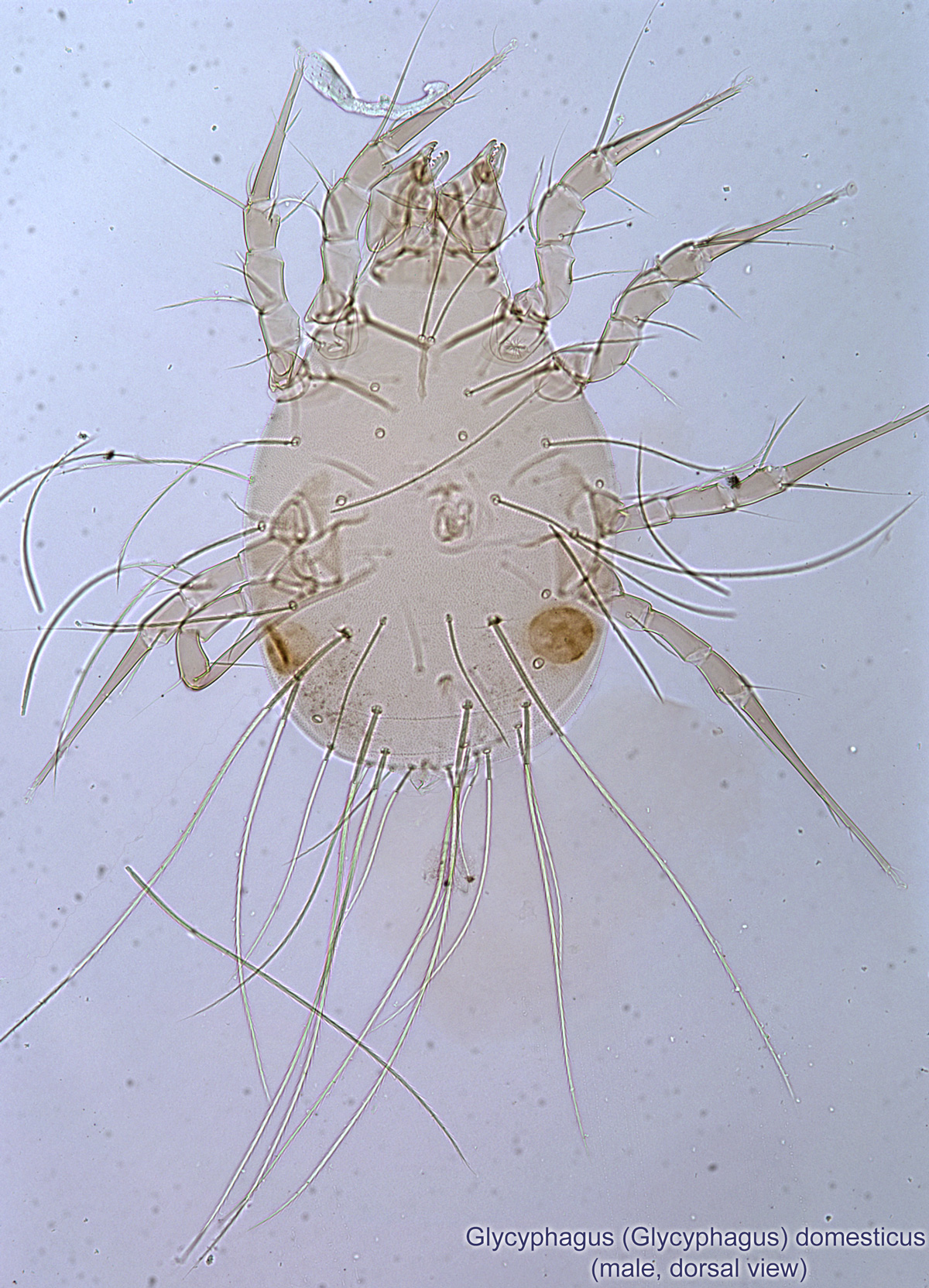 are absent. Feeding stages disperse on hosts (including bees) by active movements or by air currents.These are generalist species occurring in a variety of habitats: rodent and bird nests, stored products (as a pest), house dust, grass and hay, and others. These mites have also been found in nests of social insects, including bees. Glycyphagus causes dermatitis, gastritis, and allergies in humans.