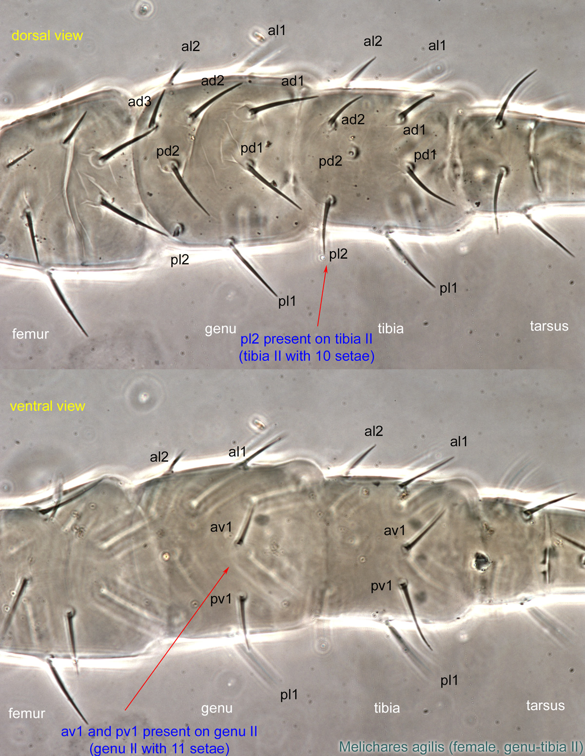 II and III with 11 and 9 setae, respectively (both av1, pv1 present); tibiatibia: