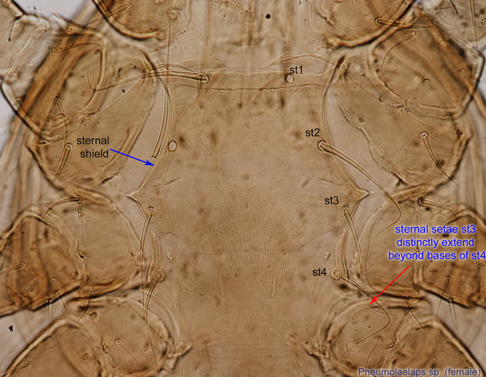 Xylocolaelaps. In Pneumolaelaps peritrematic shields extending beyond stigmata, but not extending in Xylocolaelaps (Fig. 3). In many Pneumolaelaps sternal setae st3 distinctly extending beyond bases of setae st4 (Fig. 4). In Xylocolaelaps these setae either not extending or slightly extending beyond bases of setae st4.
