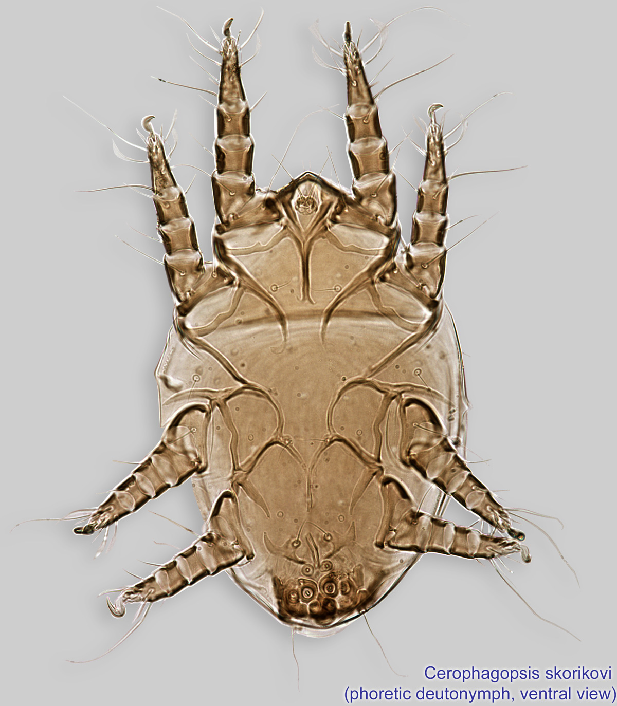 Fig. 4. Cerophagopsis skorikovi phoretic deutonymph, ventral view; empodial claws referred to as claws for simplicity; phase contrast.