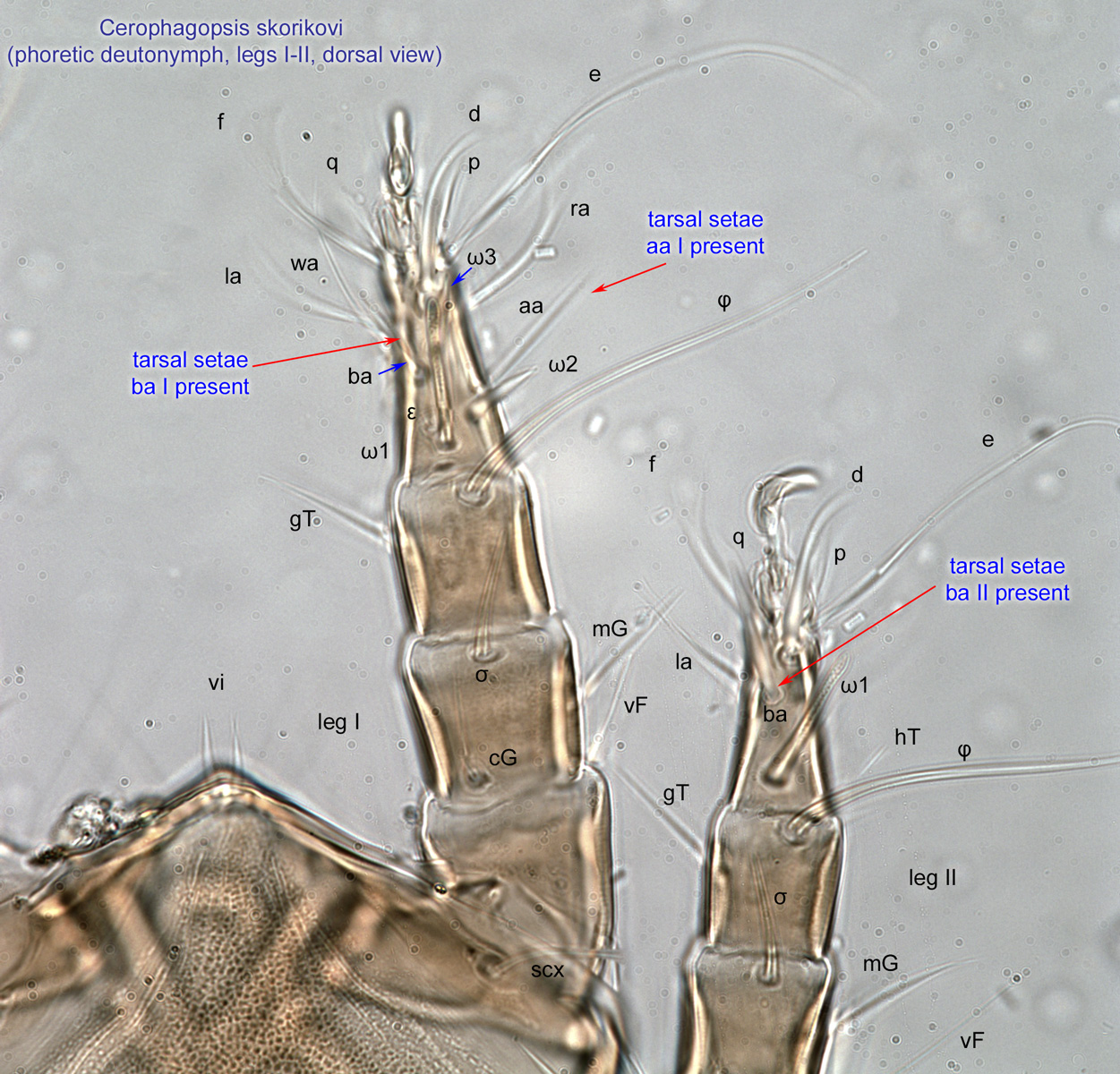 Fig. 8. Phoretic deutonymphs of the genus Centriacarus have setae p' (=q) on tarsi I-IV; by comparison, these setae are absent in other genera of Chaetodactylidae.