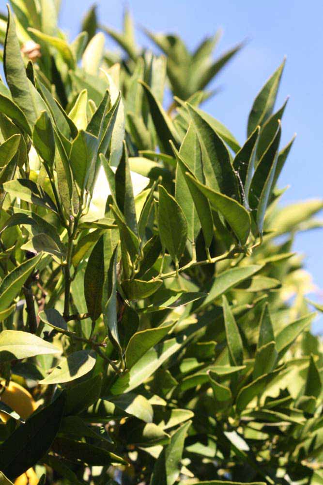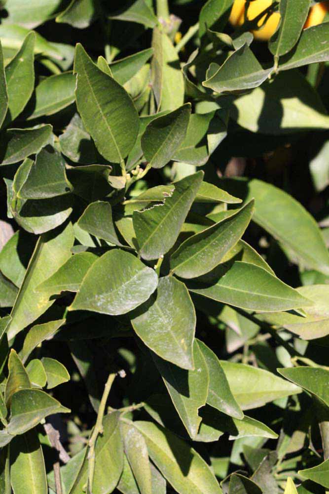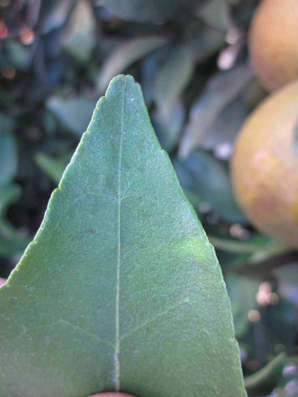 Crown compact or dense, not weeping. First-year twig surface glabrous; second- or third-year twig surface striate; thorns absent or not persistent; prickles absent or not persistent. Petiole glabrous, length medium or long; wings narrow or medium, adjoining the blade. Leaflets one, margin bluntly toothed, shade leaflet blades weakly conduplicate, sun leaflet blades weakly or strongly conduplicate. Scent of crushed leaflets sweetly orange-like. Fruit as broad as long or longer than broad; rind yellow (7-10), yellow-orange (11), orange (12), or red-orange (13); rind texture slightly rough (4-5) or medium rough (6-7); firmness leathery; navel absent; flesh orange; taste acidic-sweet.