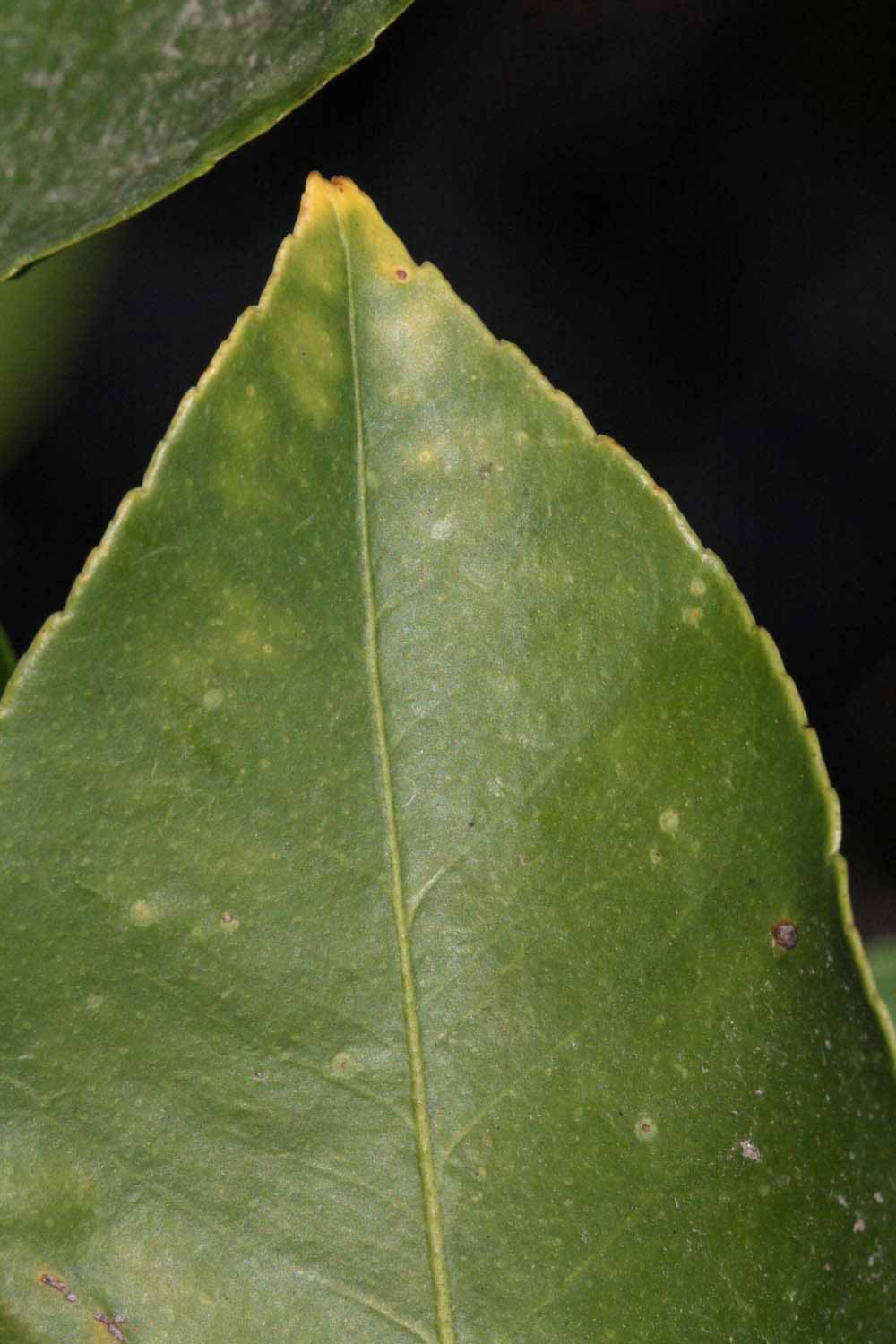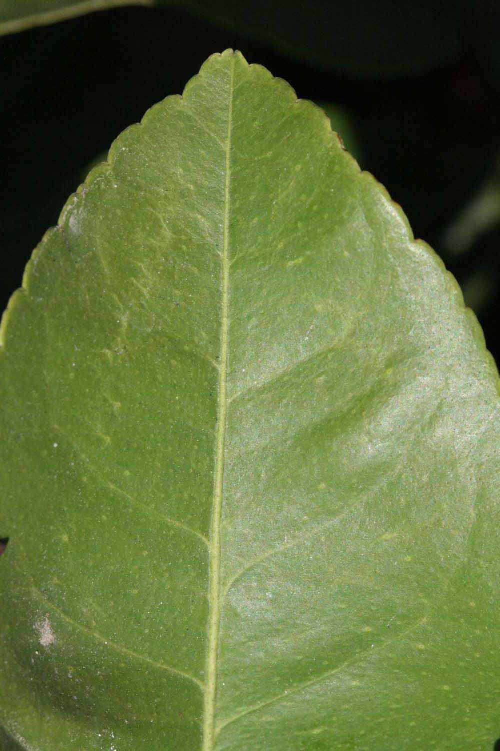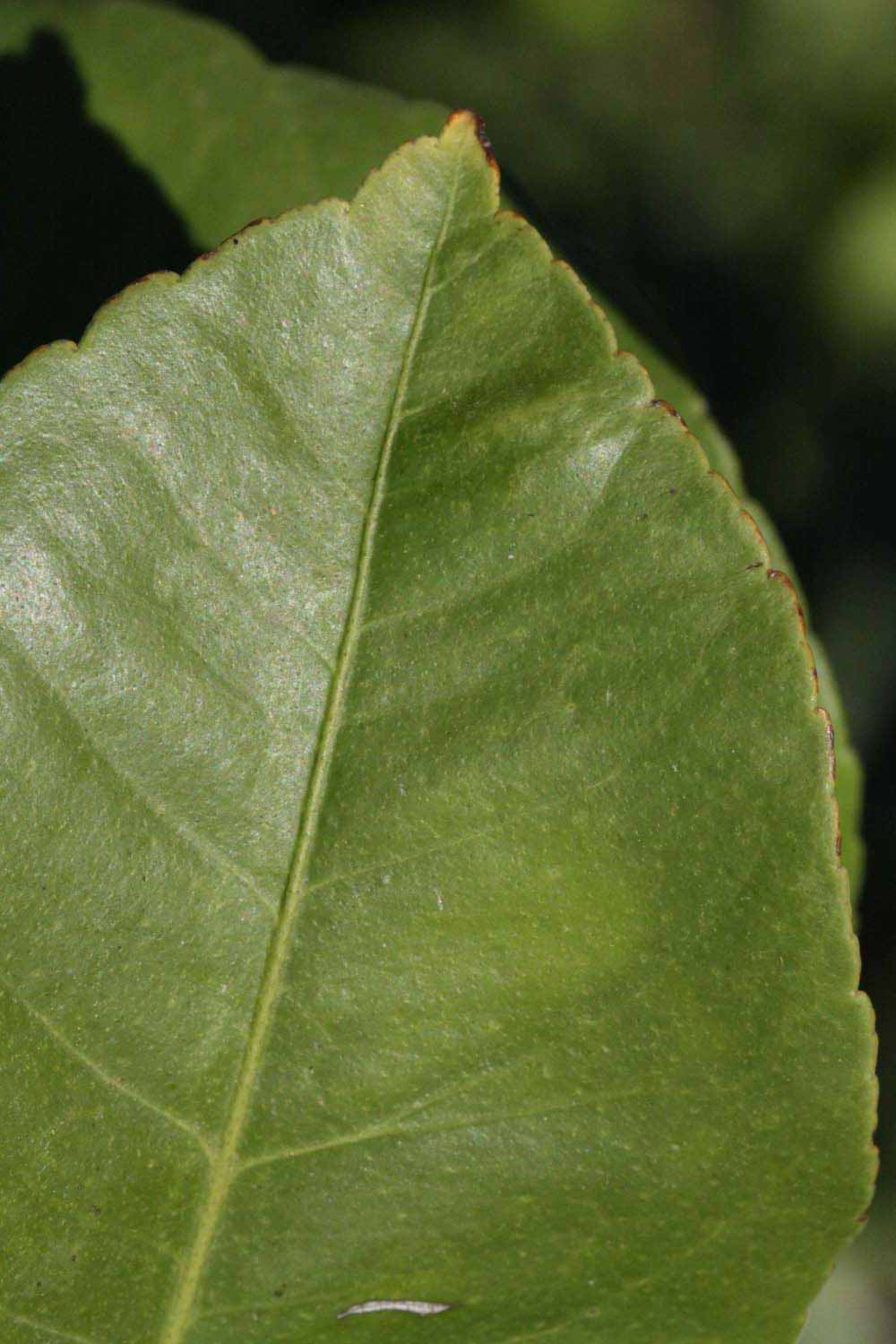 Crown compact or dense, not weeping. First-year twig surface glabrous; second- or third-year twig surface striate; thorns absent or not persistent; prickles absent or not persistent. Petiole glabrous, length short; wings absent. Leaflets one, margin bluntly toothed or serrate/serrulate, shade leaves weakly conduplicate, sun leaflet blades weakly conduplicate. Scent of crushed leaflets freshly lemon-like. Fruit as broad as long or longer than broad; rind green-yellow (6), yellow (7-10), yellow-orange (11), or orange (12); rind texture slightly rough (4-5); firmness leathery; navel absent; flesh yellow; taste sour.