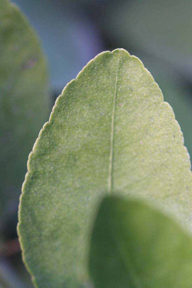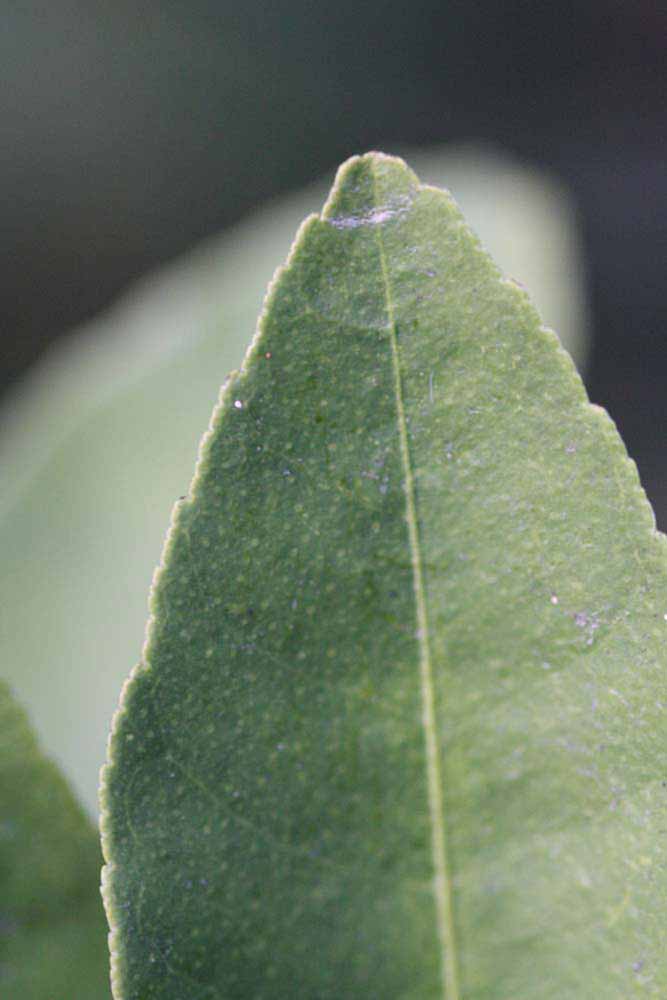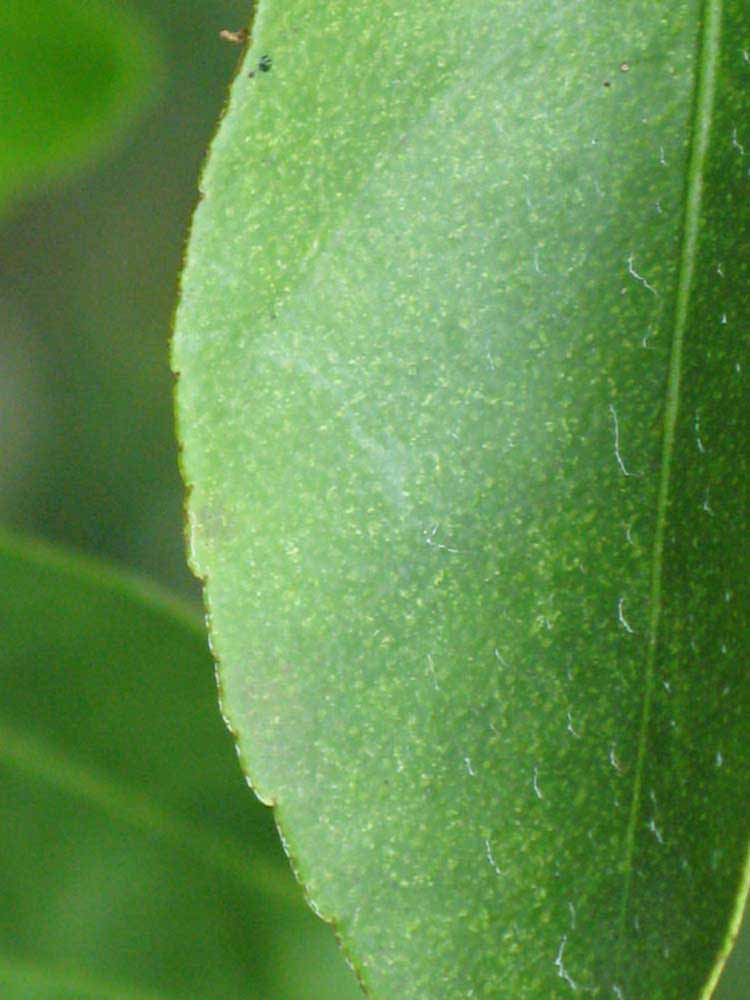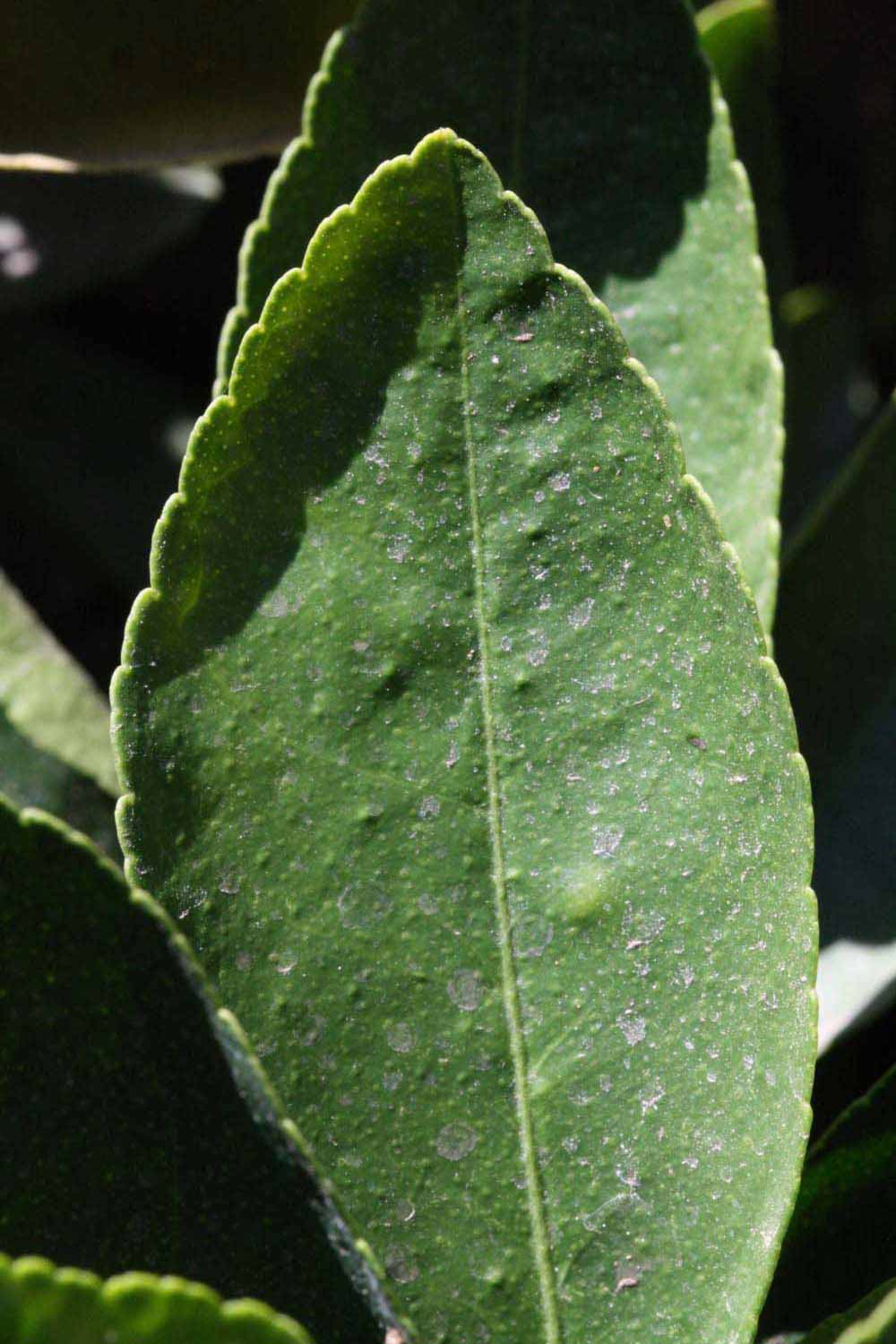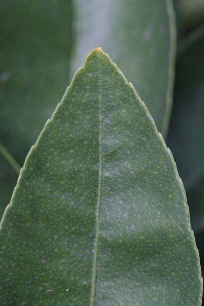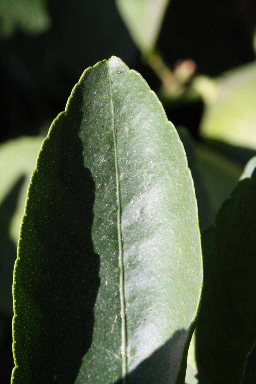 Tree medium in vigor and size, spreading and bushy with numerous, slender, willowy fine-stemmed branchlets densely armed with small, slender spines. Foliage dense and consists of small, pale green, broadly lanceolate, blunt-pointed leaves with definitely winged petioles. Flower buds and flowers small, and flowering occurs throughout year but mainly in spring and late summer. Not withstanding contrary statements in the literature, the new shoot growth is faintly purple-tinted and flower buds and young flowers faintly purple-tinged. Coloration fades rapidly, however, especially if the weather is warm, and is soon lost. Very sensitive to cold.