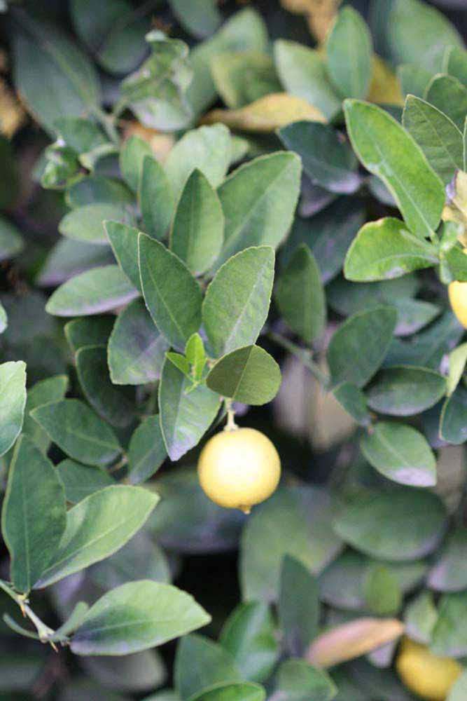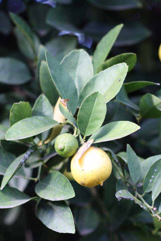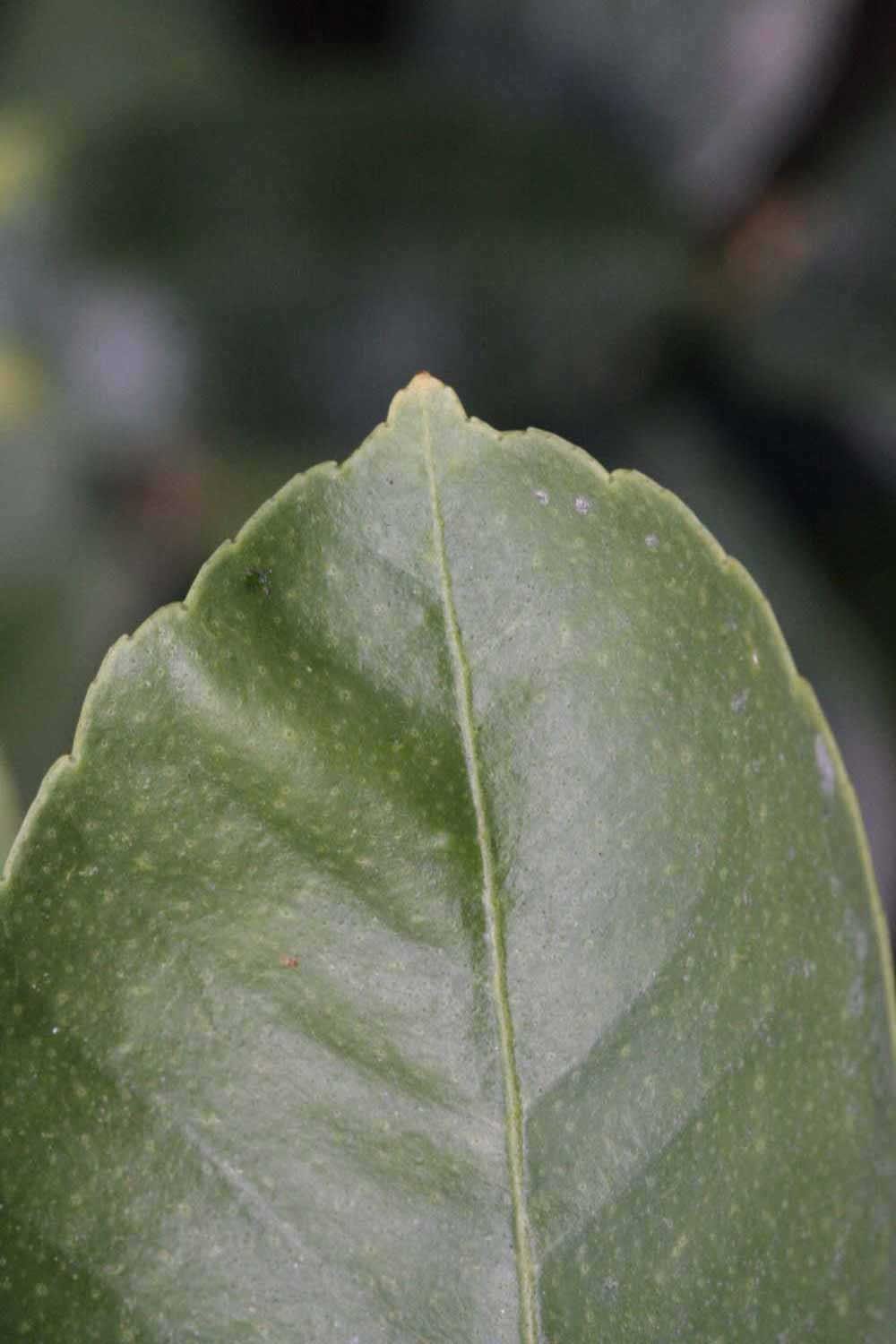 Crown compact or dense, not weeping. First-year twig surface glabrous; second- or third-year twig surface striate; thorns straight; prickles absent or not persistent. Petiole glabrous, length short; wings narrow, adjoining the blade. Leaflets one, margin bluntly toothed, shade leaflet blades weakly conduplicate, sun leaflet blades weakly or strongly conduplicate. Scent of crushed leaflets freshly lemon-like. Fruit as broad as long or longer than broad; rind light green with some break to yellow (5), green-yellow (6), or yellow (7-10); rind texture smooth (1-3) or slightly rough (4-5); firmness leathery; navel absent; flesh green/greenish; taste sour.