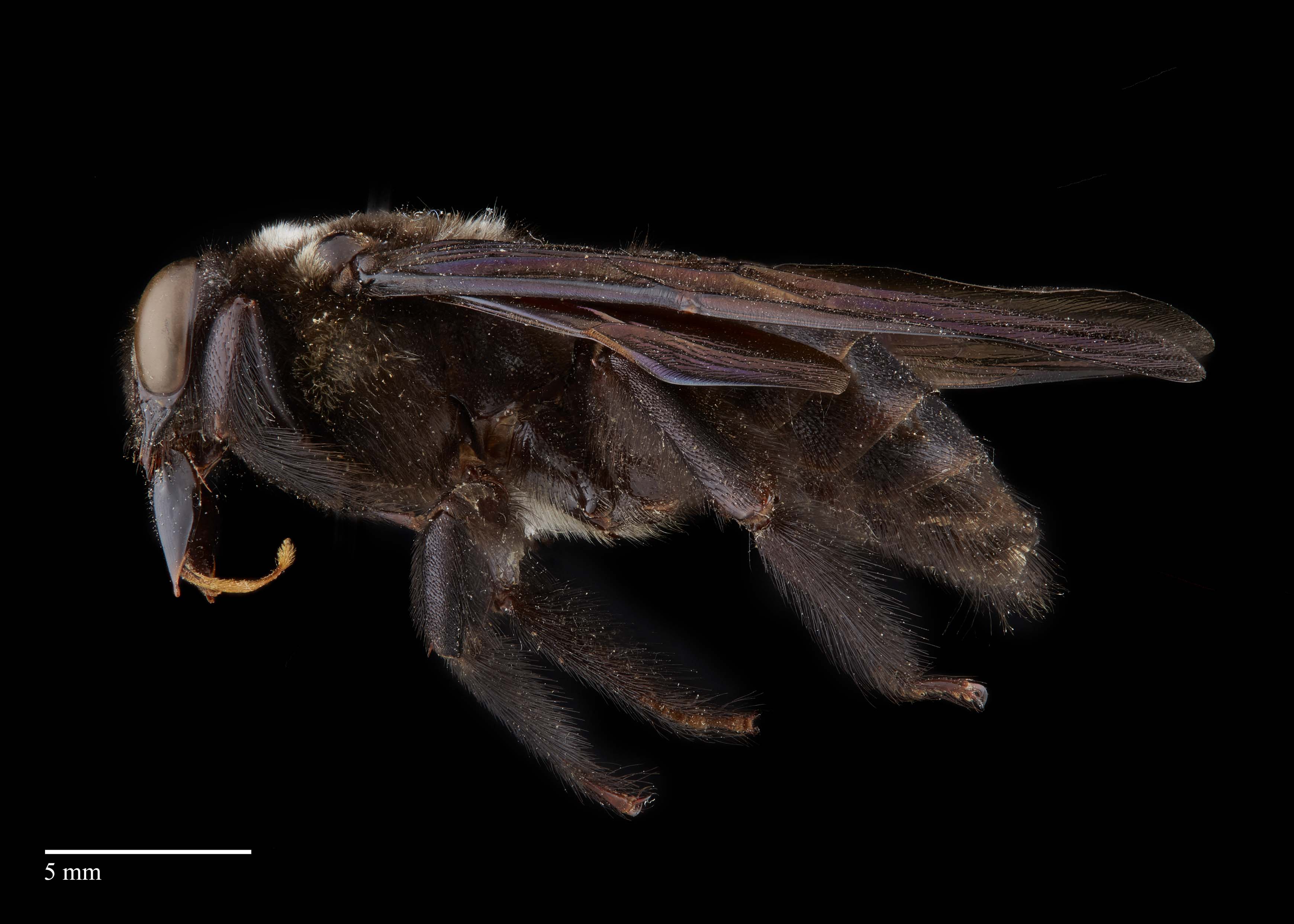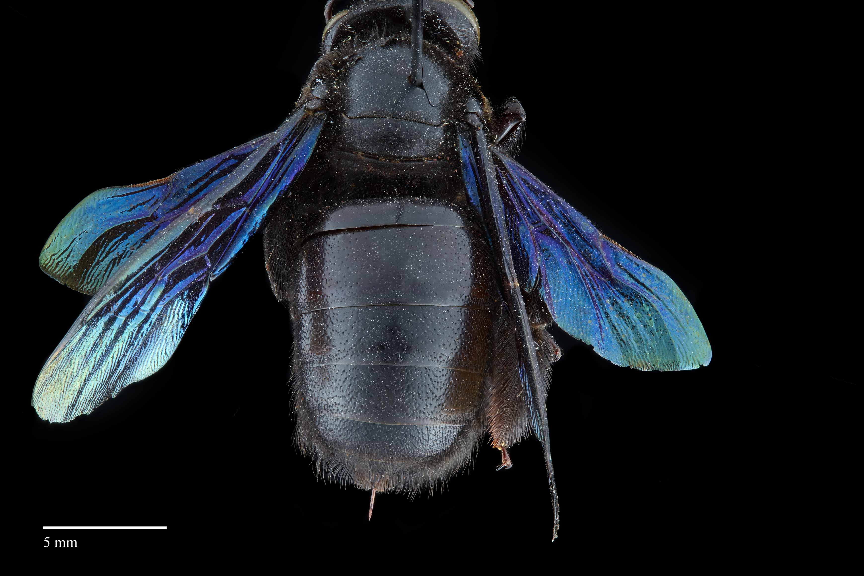 . They have black hair on the underside of their abdomen and thorax, and on their legs. Their wings have an iridescent coloring that ranges from blue or purple at the base to yellow or amber at the tips (Michener 2007Michener 2007: