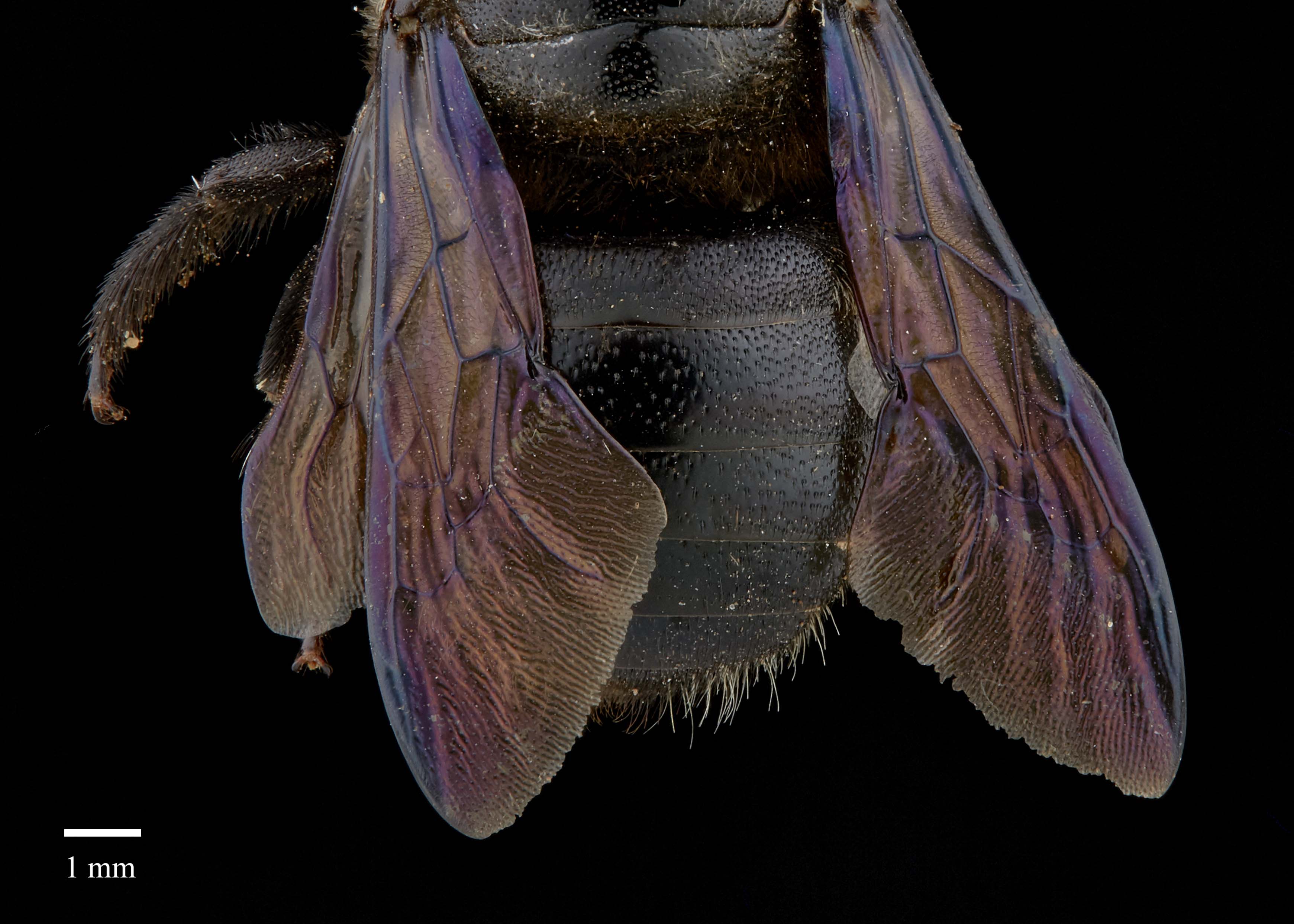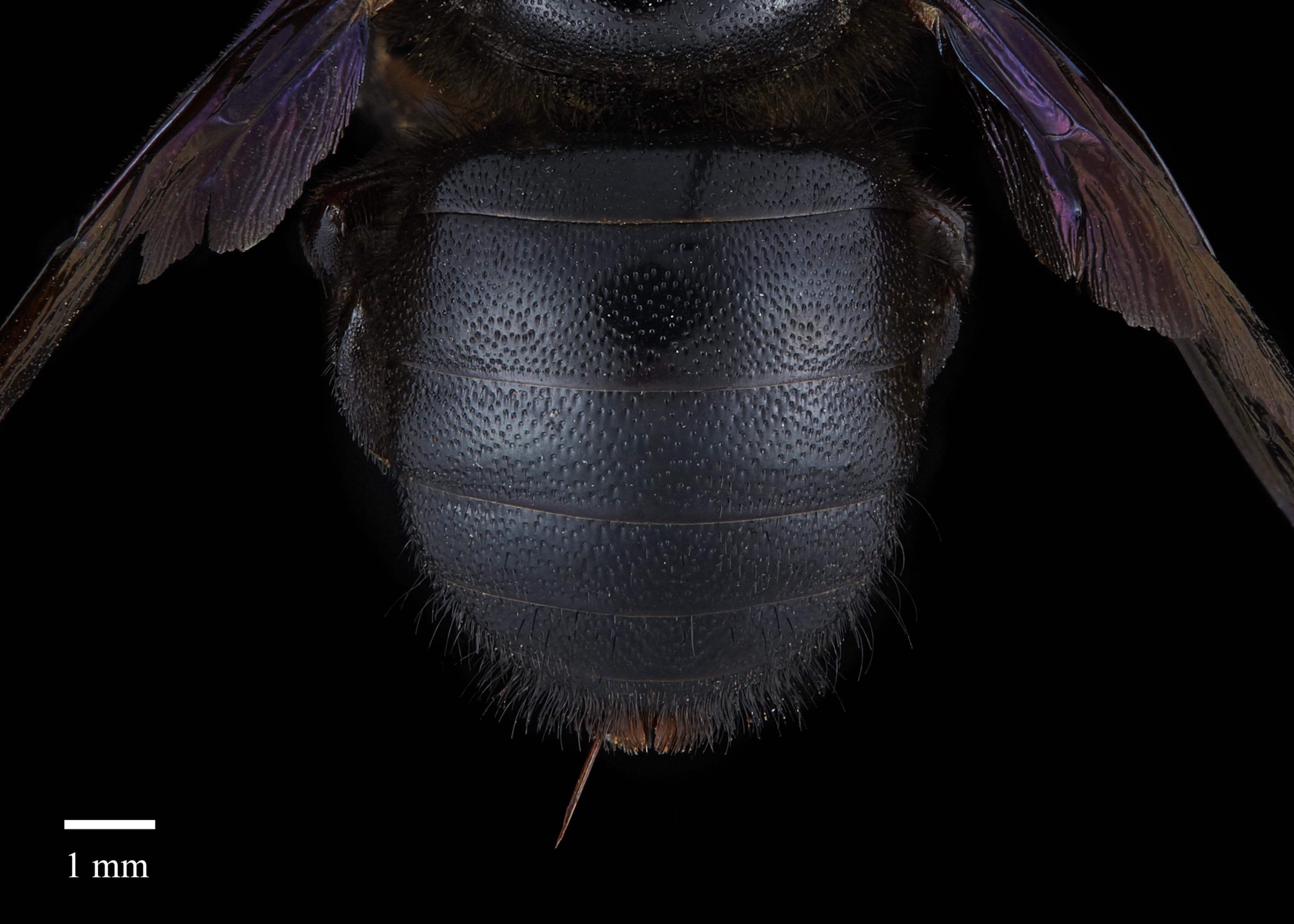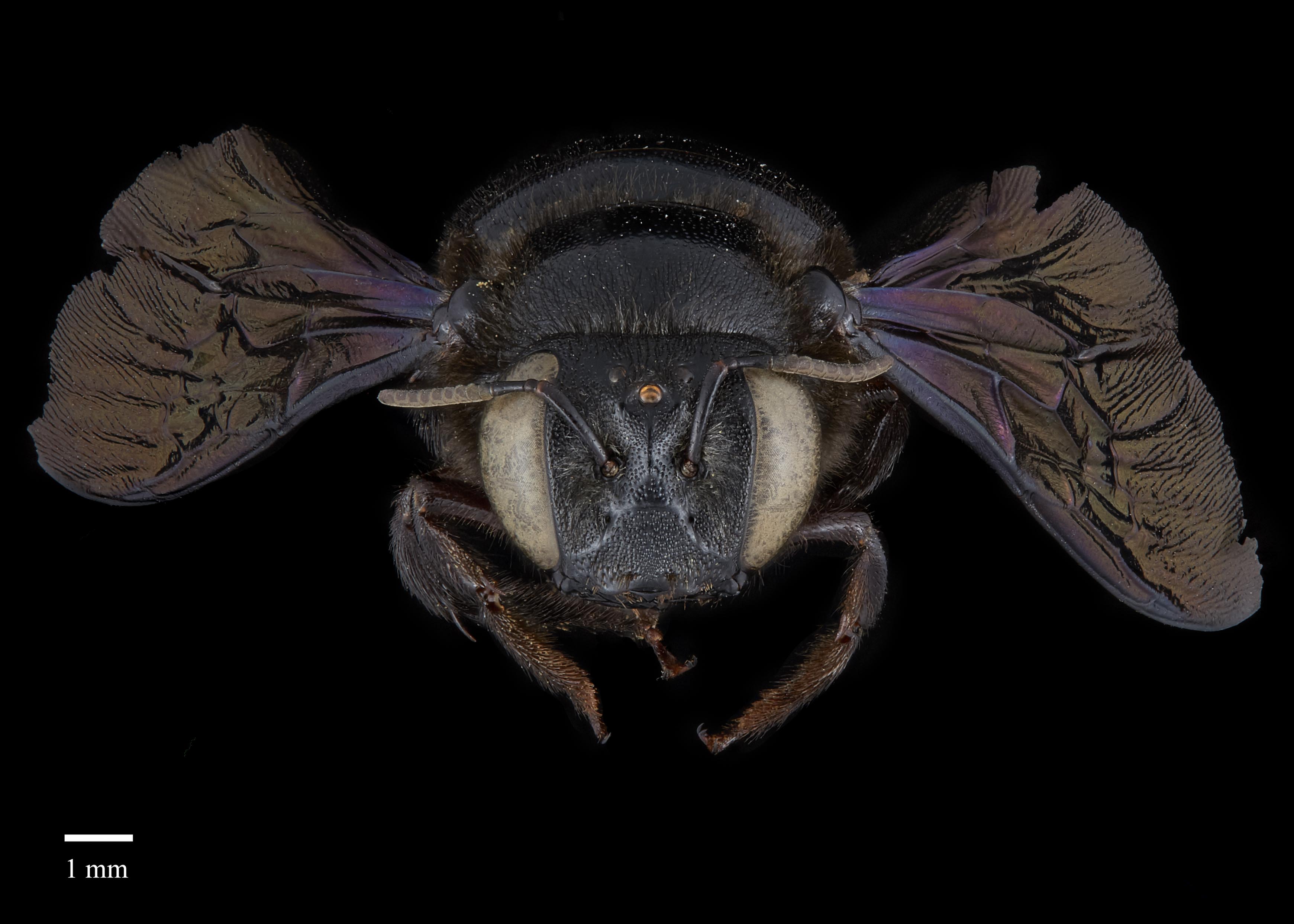 but often have at least some pale hair on the head and thorax. The wings are a medium brown and are moderately iridescent (Hurd and Moure 1963Hurd and Moure 1963: