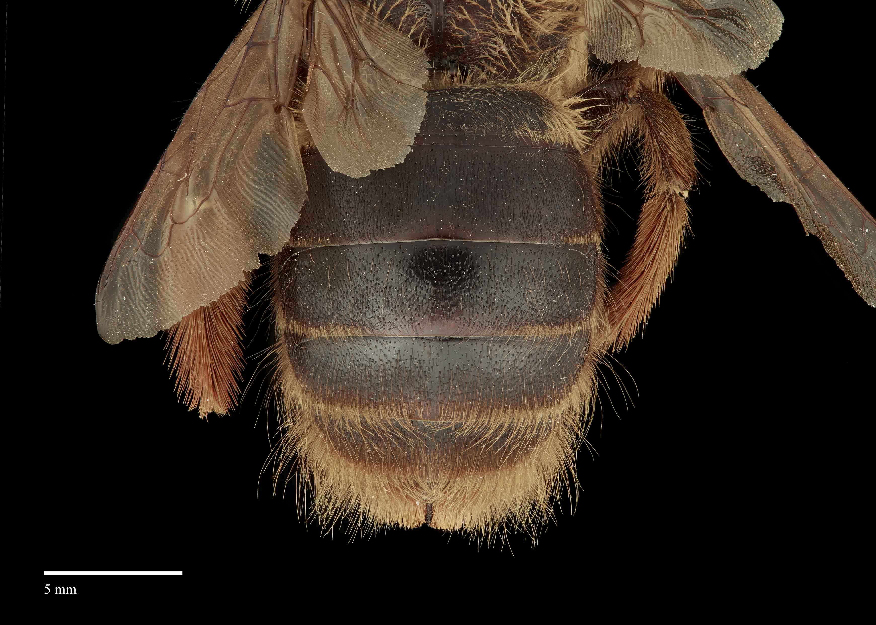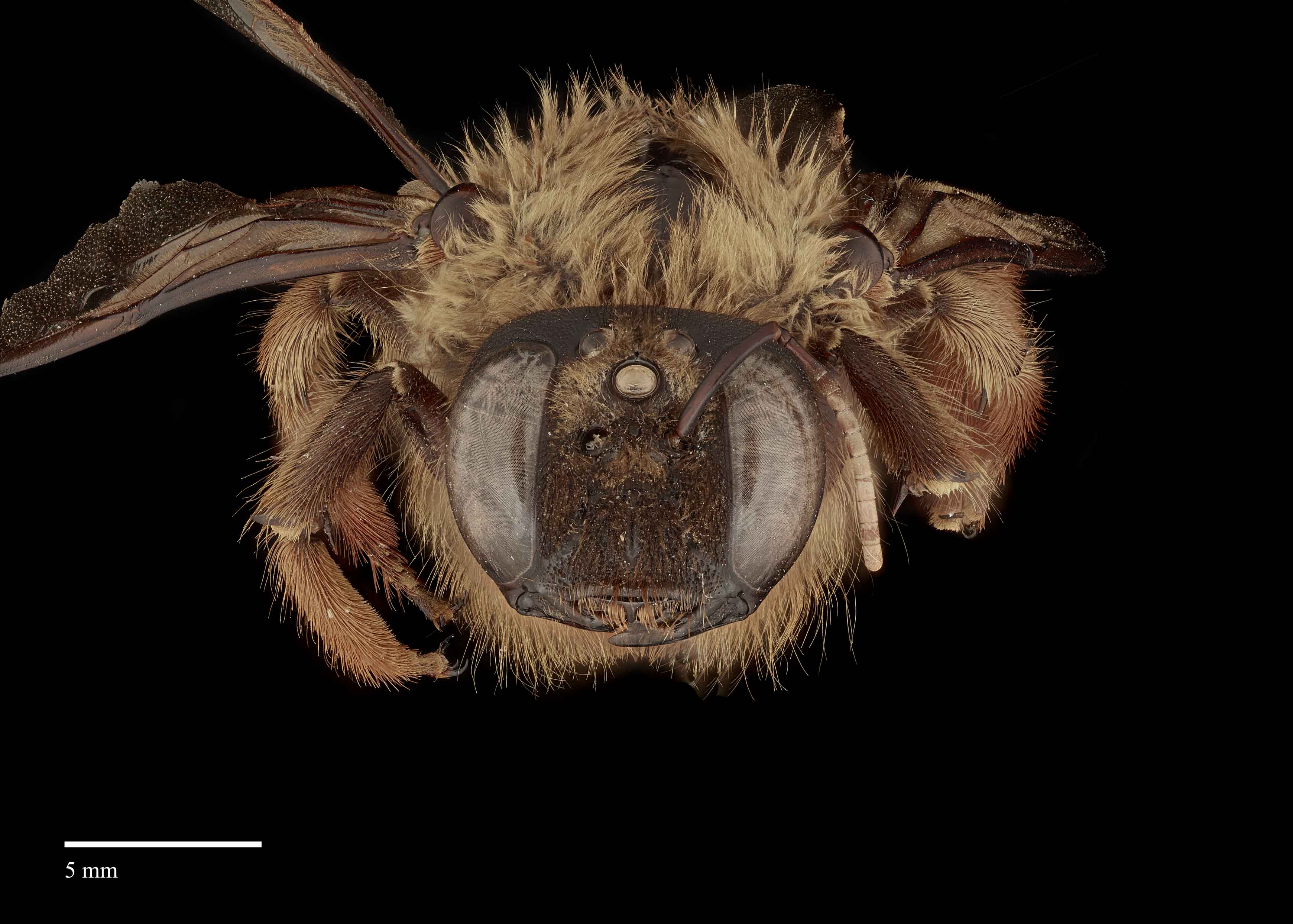 that covers the legs, head, thorax, and abdomen. Their wings are amber in color with a weak purple iridescence. Members of this subgenus are crepuscular and have distinctively large eyes and ocelliocelli: