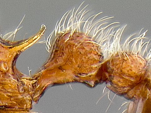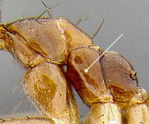 | Tibial spine, simple. A spine at the end of the hind tibia that is unmodified, and does not appear similar to a comb. In PIAkey, this character is used to separate Hypoponera (absent) from Pachycondyla (present). In order to obtain a view of the structure, it may be necessary to manipulate the specimen until a favorable perspective is achieved.