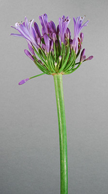 Leafless scape terminating in rounded umbel-like inflorescence (actually a racemose arrangement of cymes) of up to 30 or more mostly funnelform to trumpet-shaped flowers; 6 tepals in 2 whorls of 3, with +/- midrib on undersides, and with lobes longer than tubes; stamens 6, curving upward near anthers. Cultivar and/or species variation