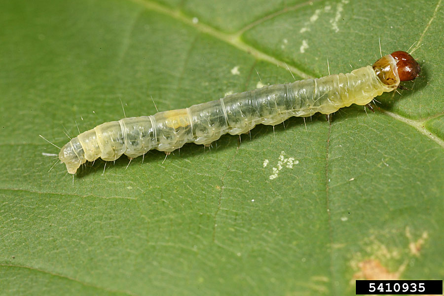 Last instar larvae are 15-20 mm in length. The abdomen is dull pale green to dark olive green with pale pinacula. The head is reddish brown to dark brown. The greenish-brown prothoracic shield is shaded posteriorly with dark brown to black; the degree of shading varies. Thoracic legs are brown to black.