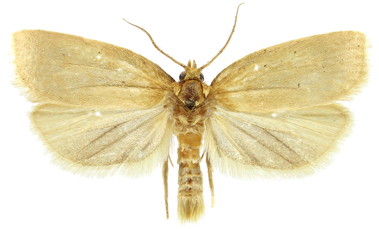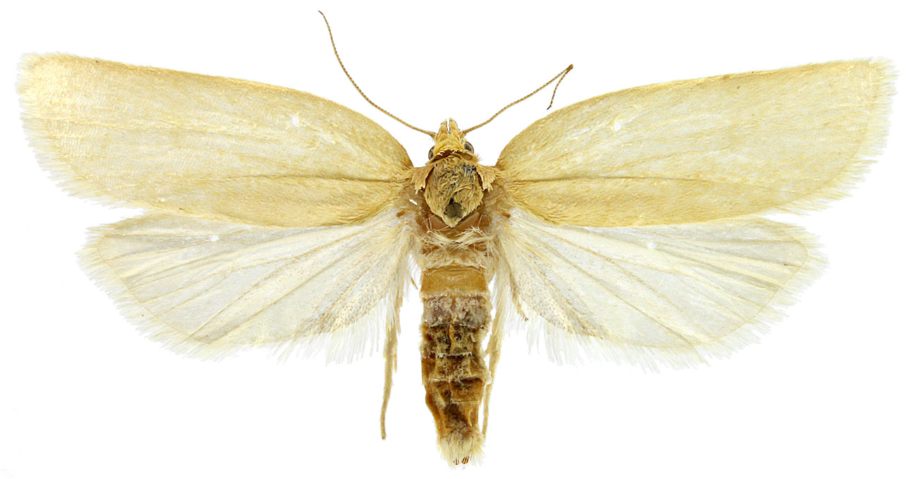 Forewing color varies from pale yellow to cream to light brown. Many individuals are unmarked although some exhibit a faint reticulated forewing pattern. Hindwings are brownish gray and white or yellowish. Males lack a forewing costal fold.
