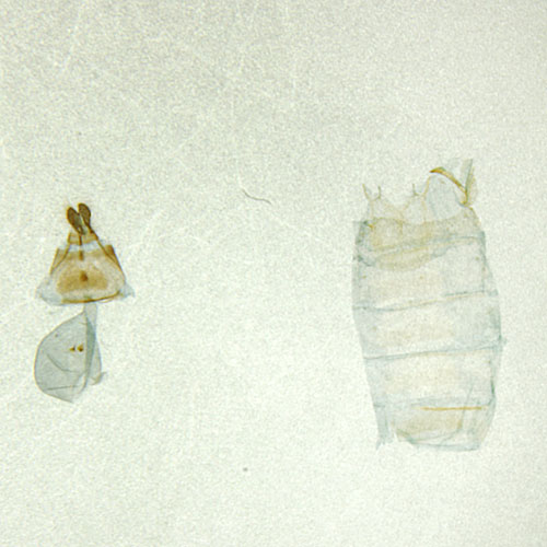 onto the center of the slide. Euparal is soluble in alcohol, so the genitalia can be directly moved from the petri dish onto the slide.