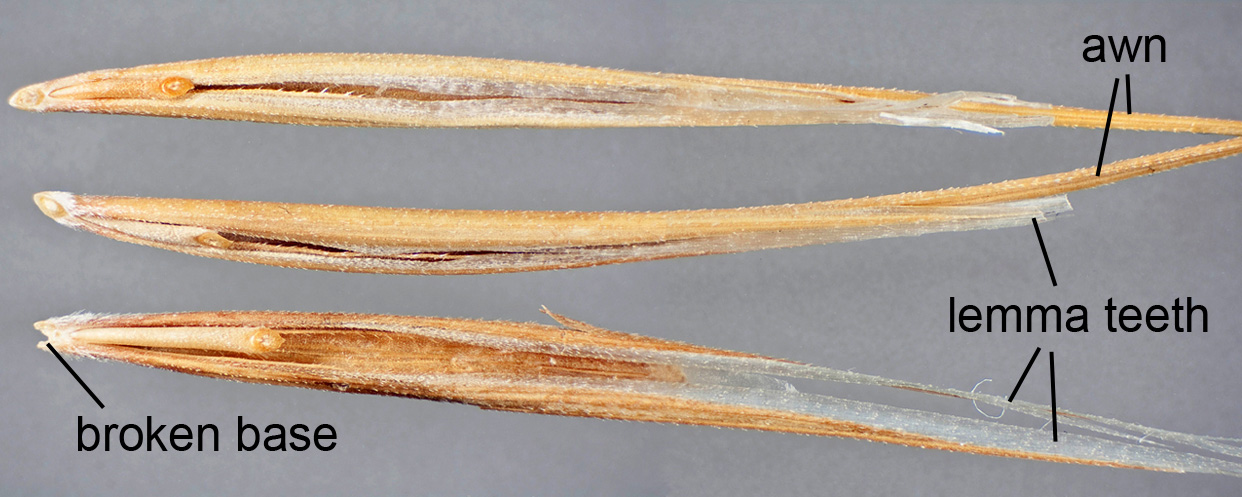 Lemma linear-lanceolate, sometimes slightly arched, 18–35(45) mm long (excluding awn), chartaceous, much thinner (hyaline) on margins, with rounded back (no keel), 7-veined, midvein ribbed, lateral veins obscure to somewhat ribbed, surface scaberulous, apex acuminate, bifid, teeth 3–7 mm long, awn subapical, 30–75 mm long, scabrous.