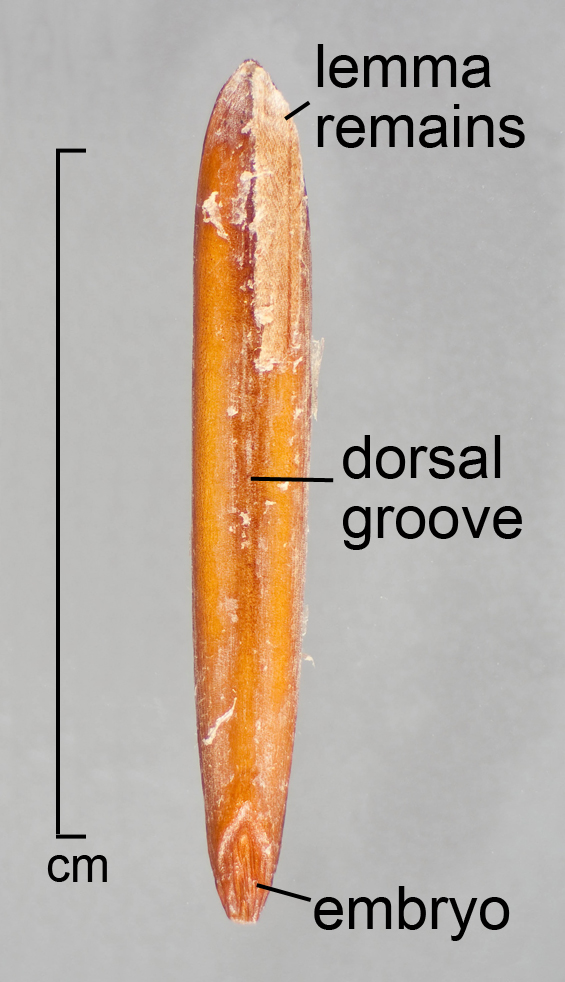 Caryopsis linear, 11–14 mm long x 1–2.8 mm wide, brown, apex fleshy and hairy, hilum linear, same length as caryopsis.