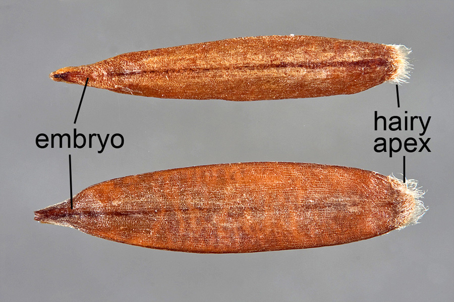Caryopsis fusiform to elliptic, 6–7.5 mm long x 1.5–2 mm wide, brown, apex fleshy and hairy, dorsal side with a distinct longitudinal groove, hilum a prominent linear groove, same length as caryopsis.