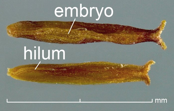 Caryopsis elliptic, trigonous, to 2.5 mm long x 0.5 mm wide, brown, apex tipped with 2 stylar remnants, embryo to 1 mm long, hilum linear, ca. 1 mm long, in shallow groove.