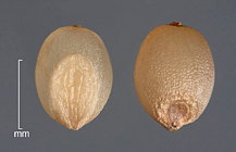 Caryopsis round to oblong, dorsally compressed, 1.2–1.5(2) mm long x 1–1.3 mm wide, tan, embryo 0.5–0.7 length of caryopsis, hilum ± round.