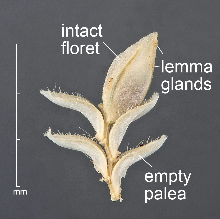 Lemma broadly ovate to round, (1.3)2–2.8 mm long, chartaceous to membranous, yellow or gray, keeled, 3-veined, midvein typically with 1–3 glands, lateral veins ± distinct, apex acute to obtuse.