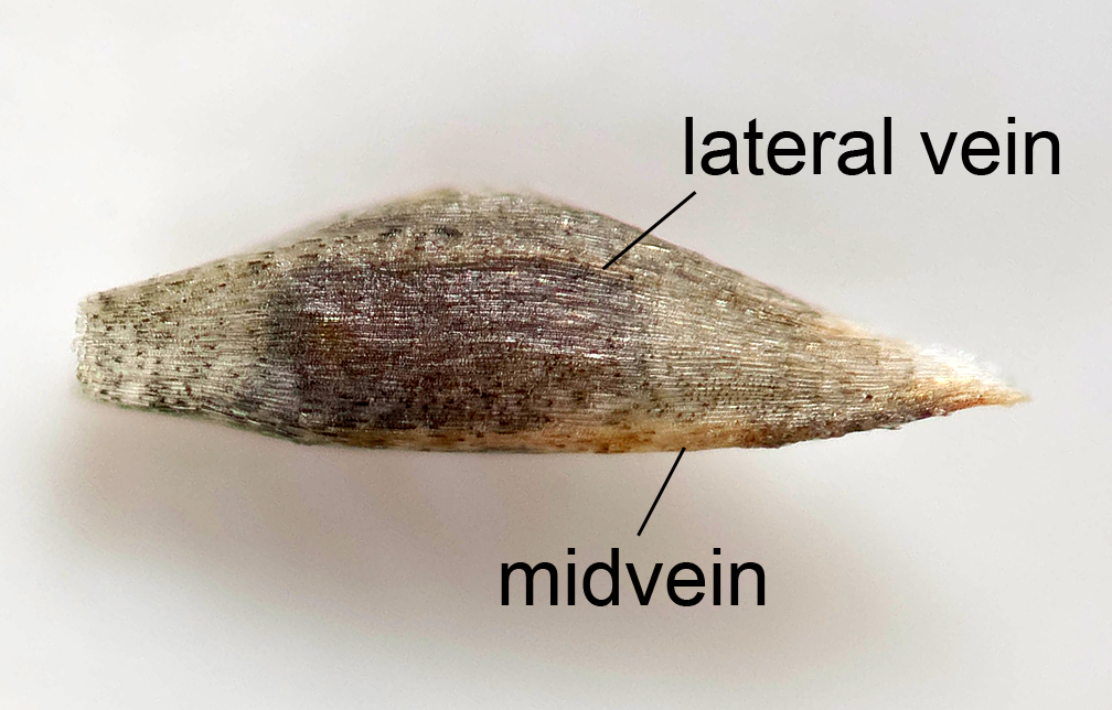 Lemma ovate, (1.2)2–2.2(2.4) mm long, membranous, grayish-green, sometimes mottled red, surface glabrous or with a few hairs, keeled, 3-veined, midvein scabrous but eglandular, lateral veins ± distinct, apex acute.