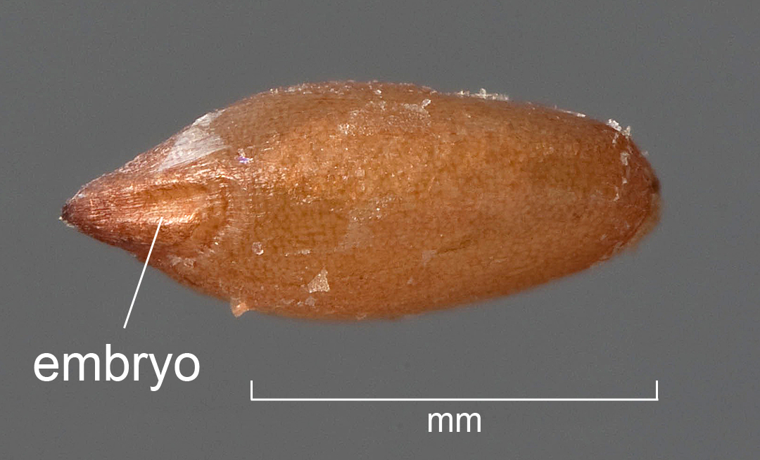 Caryopsis ovate to lanceolate, laterally compressed, 1–1.5 mm long x 0.4–0.5 mm wide, brown, embryo <0.33 length of caryopsis, hilum short or rarely long linear, sitting in longitudinal groove.