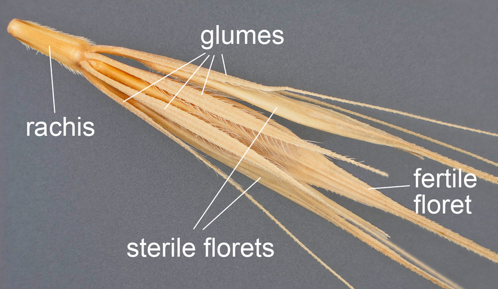 Disseminule is a deciduous cluster of 3 spikelets (1 fertile in center, 2 sterile laterals) subtended by a persistent pubescent rachis internode measuring 2–2.2 mm long.