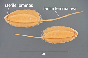 Caryopsis broadly elliptic to broadly oblong, laterally compressed, 4.5–8 mm long x 2–3.5 mm wide, longitudinally ridged, brown, tan or white.