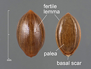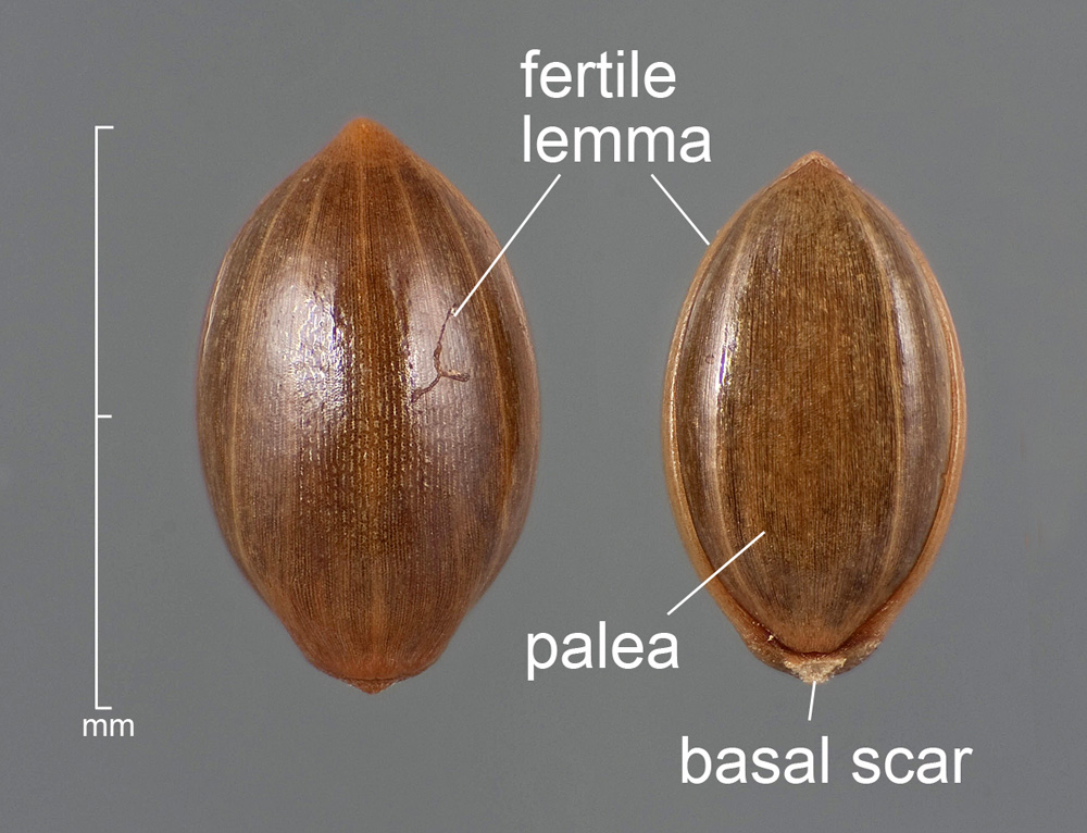 Fertile floret held loosely by outer bracts and ± exposed at maturity. Fertile lemma elliptic, dorsally compressed, (1.4)1.8–2.2(3) mm long, indurate, without keel, straw-colored to very dark brown with pale veins, shiny, glabrous, surface faintly striolate, margins involute, apex acute. Fertile palea indurate, margins involute.